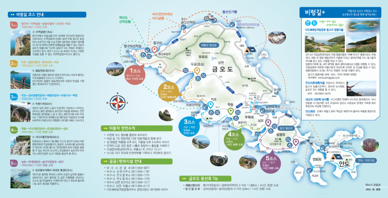 백야선착장(배 45분)~함구미(1코스시작)(버스 35분 또는 택시 35분)~장지(5코스종점) 후 비렁길 5~3코스 트레킹 종료, 직포(3코스시작)(버스 30분, 택시 30분)~함구미(1코스시작)(배 45분)~백야선착장 도착.